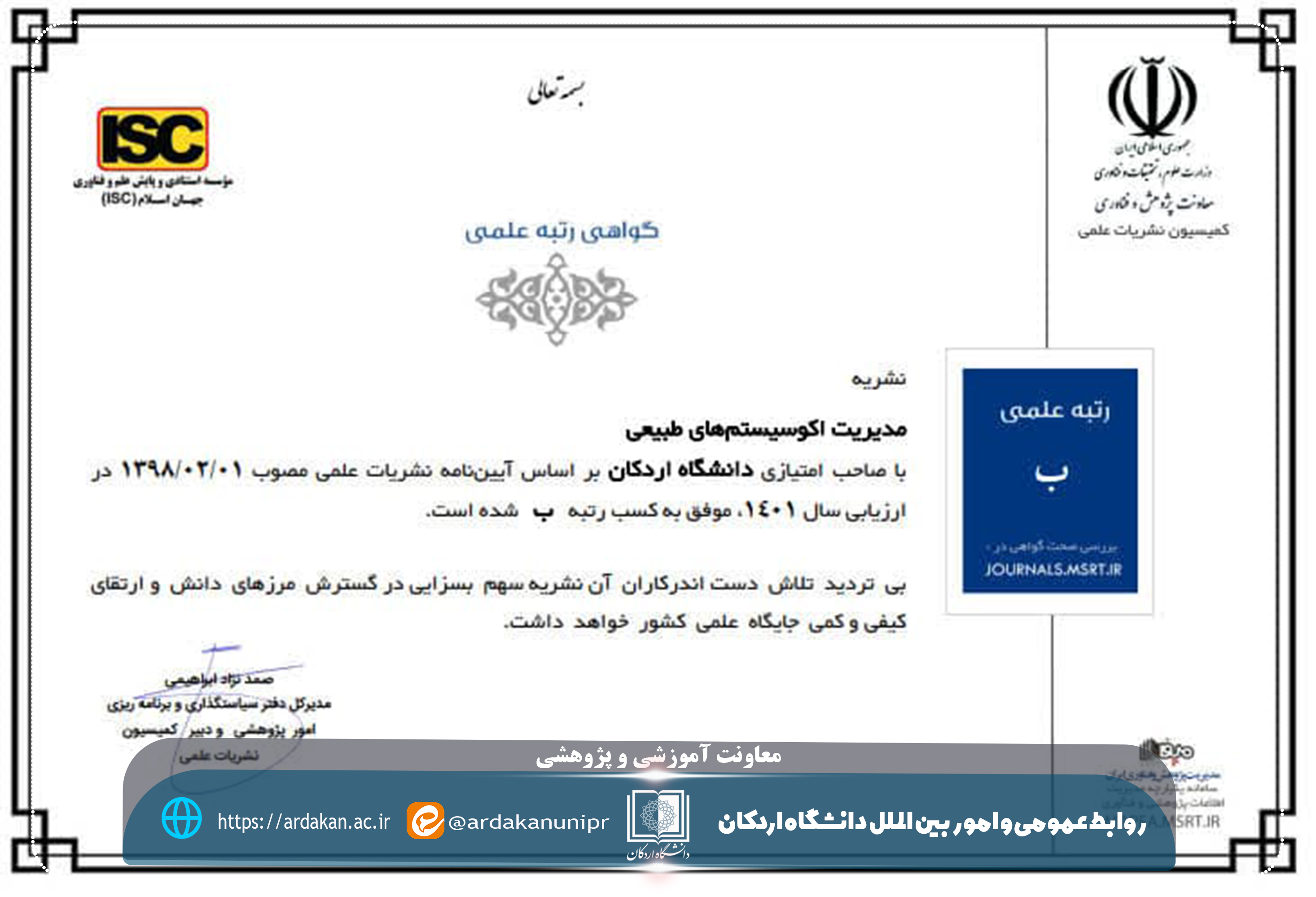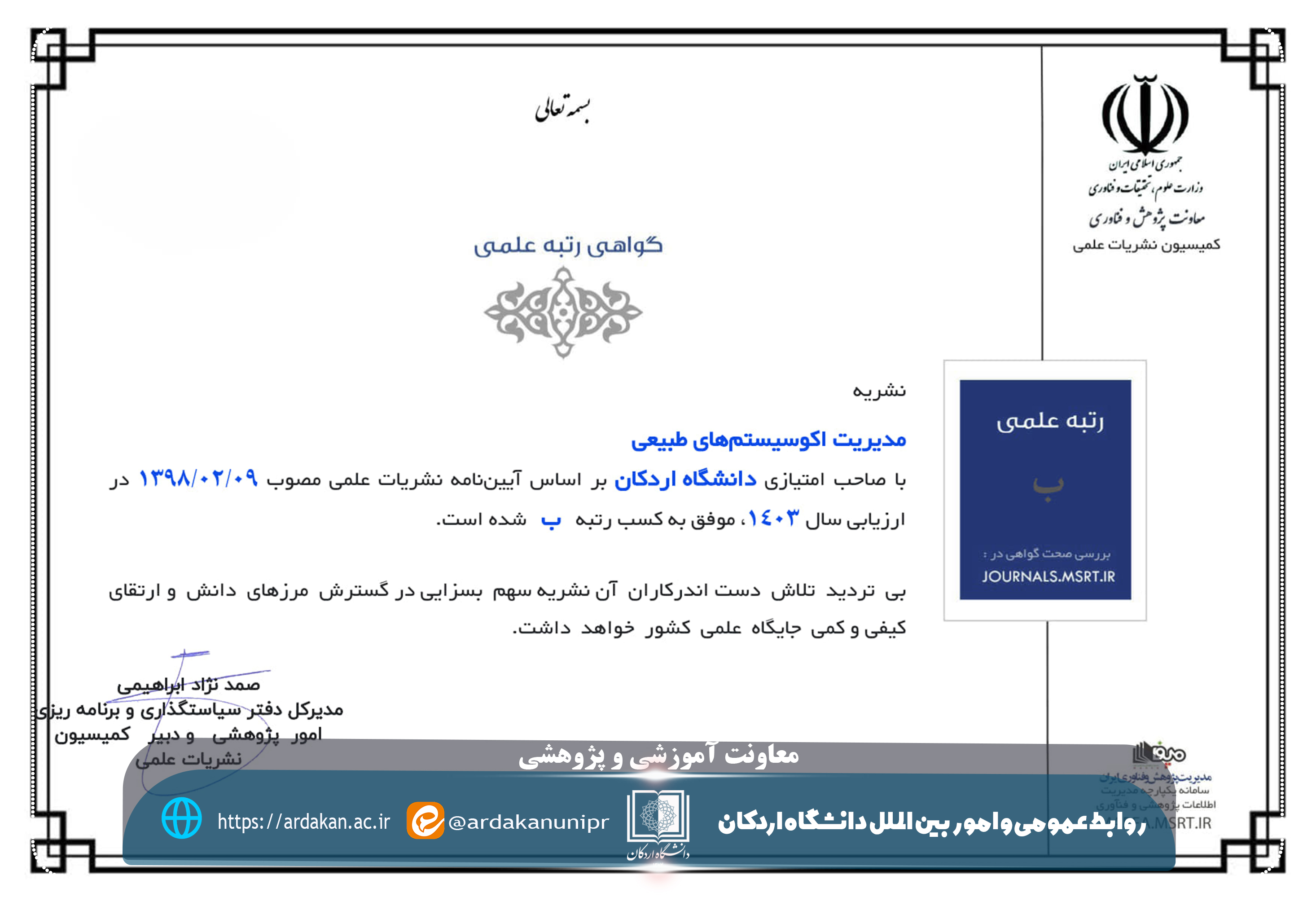 - اخذ مجوز نشریه علمی "مدیریت اکوسیستمهای طبیعی" با رتبه "ب"