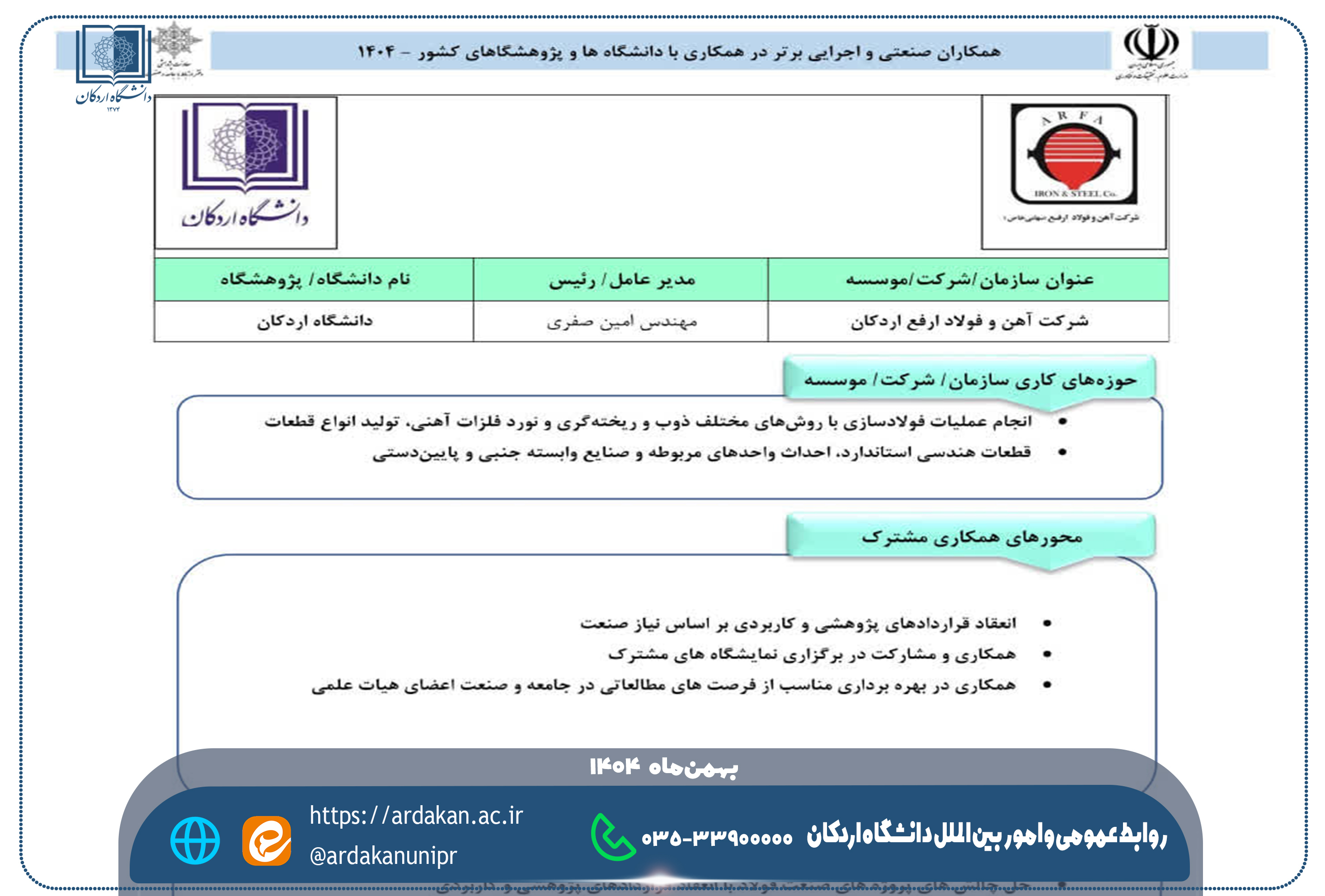 شرکت آهن و فولاد ارفع همکار صنعتی برگزیده دانشگاه اردکان در سال 1404