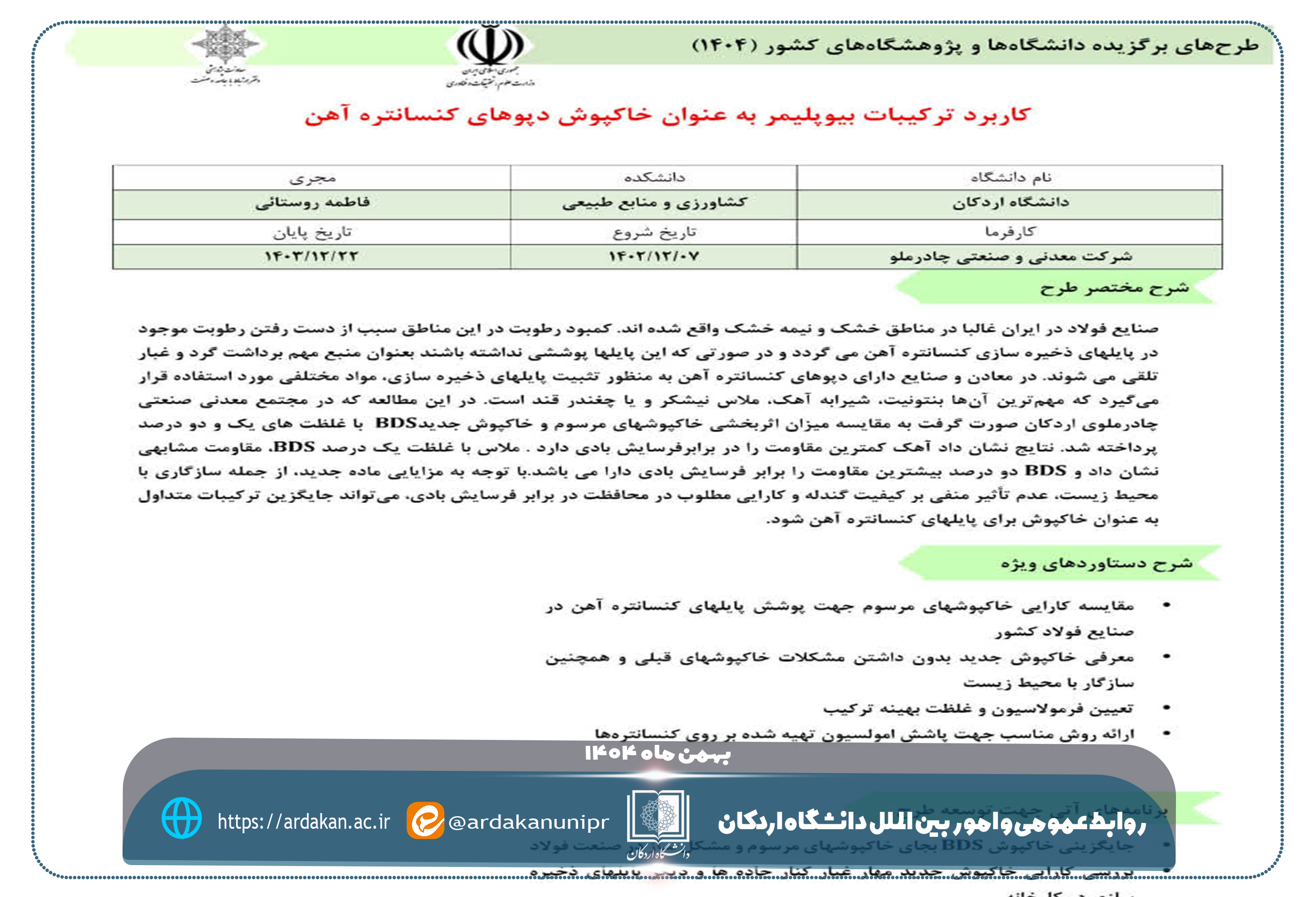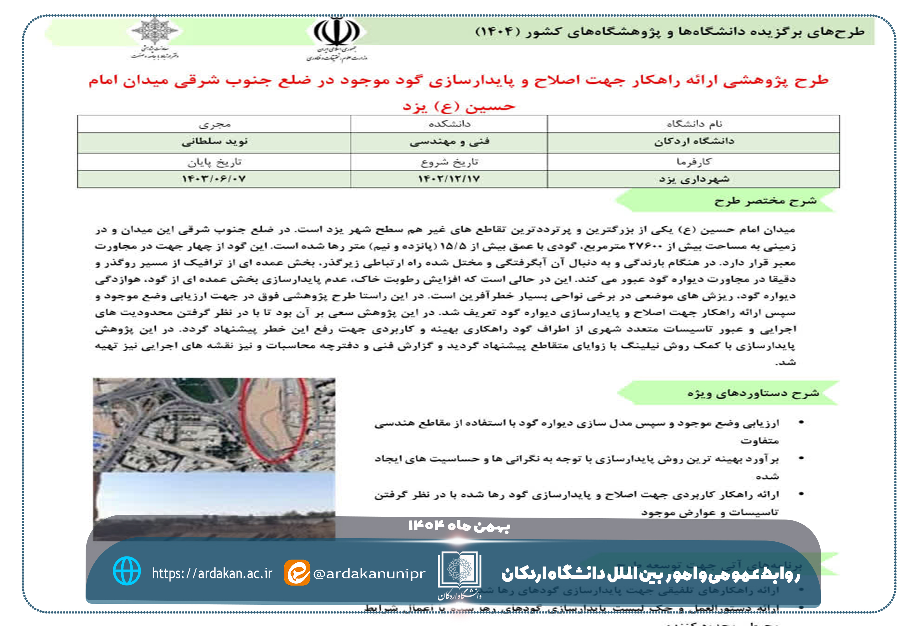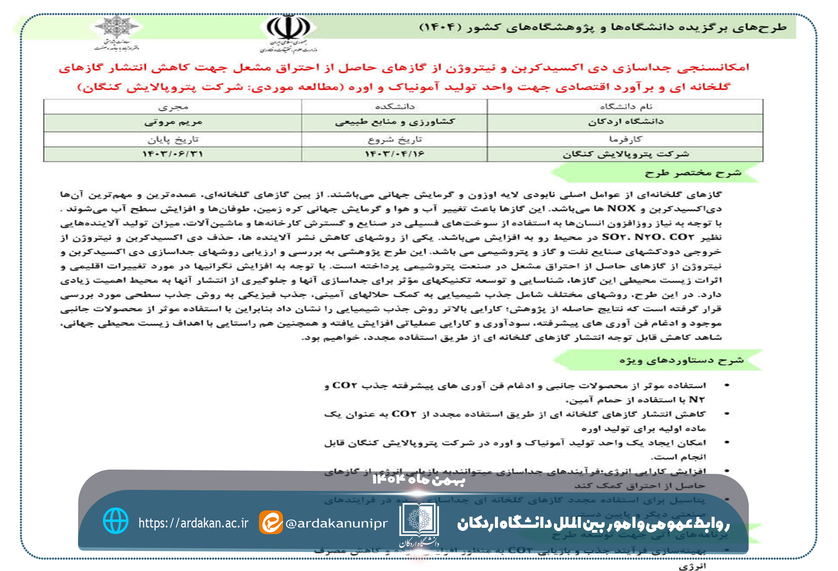 در این مجموعه؛ خانم دکتر مریم مروتی با عنوان «امکانسنجی جداسازی دی‌اکسیدکربن و  نیتروژن از گازهای حاصل از احتراق مشعل جهت کاهش انتشار گازهای گلخانه‌ای و برآورد اقتصادی جهت واحد تولید آمونیاک و اوره» با شرکت پتروپالایش کنگان؛ طرح آقای دکتر نوید سلطانی با عنوان «ارائه راهکار جهت اصلاح و پایدارسازی گود موجود در ضلع جنوب شرقی میدان امام حسین (ع) یزد» با شهرداری یزد؛ و طرح خانم دکتر فاطمه روستایی با عنوان «کاربرد ترکیبات بیوپلیمر به عنوان خاکپوش دپوهای کنسانتره آهن» با شرکت معدنی و صنعتی چادرملو، به عنوان طرح‌های پژوهشی برگزیده معرفی شده است. روابط عمومی و امور بین‌الملل دانشگاه، ضمن قدردانی از تلاش‌های موثر و سودمند سه عضو محترم هیات علمی دانشگاه، این افتخار را به تمام جامعه علمی دانشگاهیان و شهرستان اردکان تبریک گفته و تدوام این موفقیت‌ها را از خداوند علیم‌ مسئلت دارد. امید است با استقرار نظام مسائل و جهت‌دهی فعالیت و تحقیقات شاهد اثربخشی حوزه آموزش عالی در رفع نیازهای جامعه و صنعت باشیم.